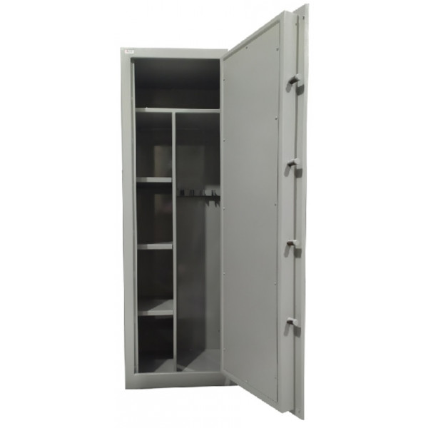 Cofre constituído em aço modelo armário, não possui blindagem de concreto, possui amplo espaço interno para a guarda de armas longas e curtas, munições, documentos, jóias, etc.