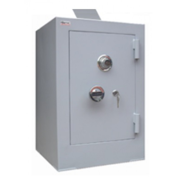 Possui 1 boca de lobo medindo 12cm x 2cm de espessura para passagem de envelopes e dinheiro.