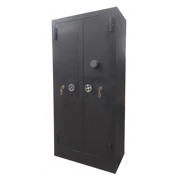 Cofre constituído em aço modelo armário, possui blindagem de concreto na base, possui amplo espaço interno para a guarda de armas longas e curtas, munições, documentos, jóias, etc.